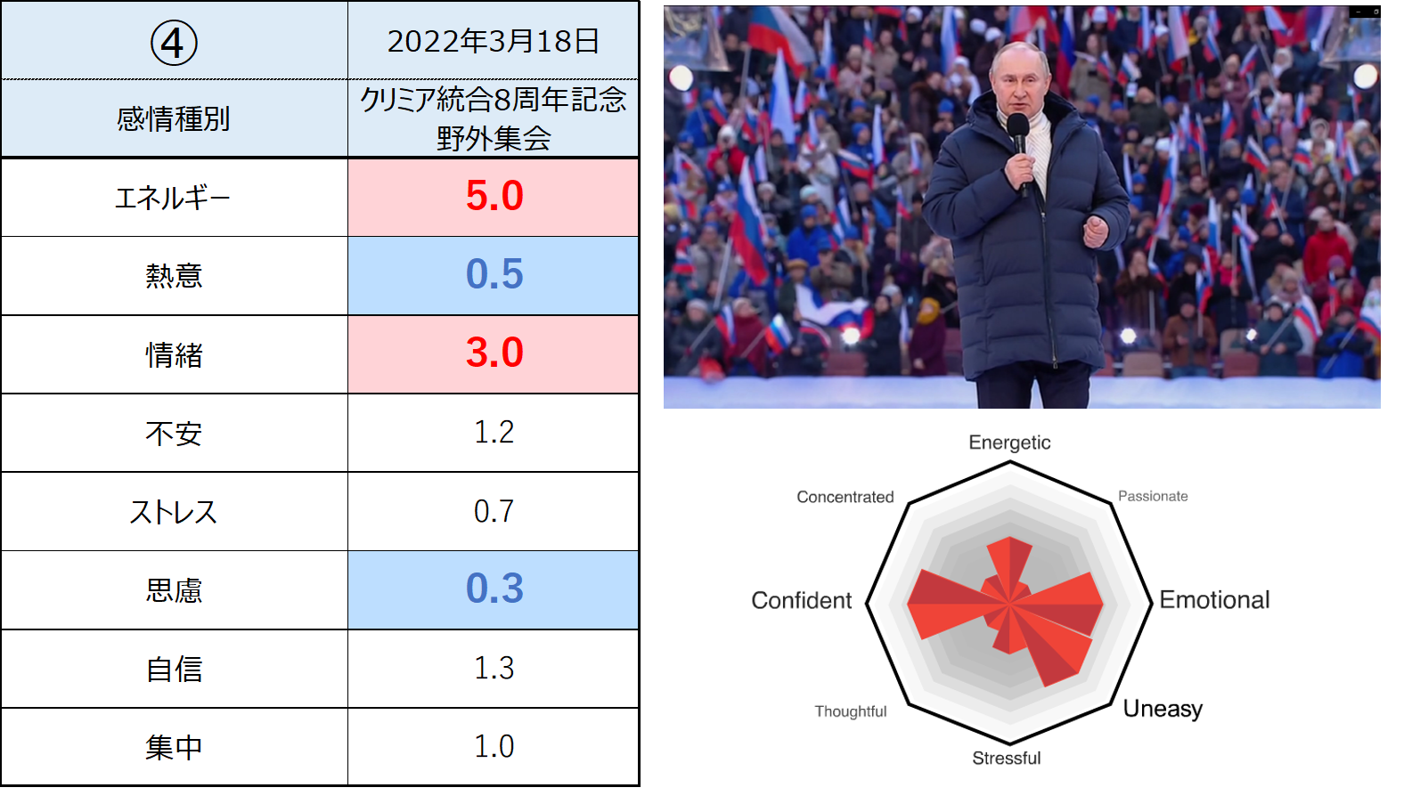 このクリミア統合8周年記念式典での演説は、そもそも統合を仕掛けたのがプーチン氏自身であり、かつ野外の大会場で行われたことも影響してプーチン大統領はかなり高揚した感情状態にあったと推測され、エネルギーと情緒の数値が高くなっています。演説する内容は予め決められていた様子で考える必要がなかった故に思慮の数値は低くなっています。