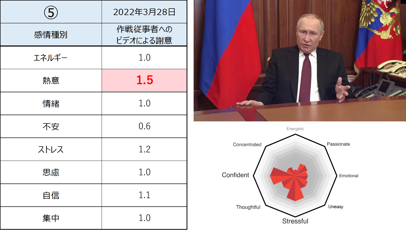 ウクライナ作戦従事者への謝意は淡々としていますが、作戦自体は思い通りになっていないので、兵士を鼓舞する為に情熱をもって語りかけていると思われます。これが熱意の数値が高くなっている理由と思われます。