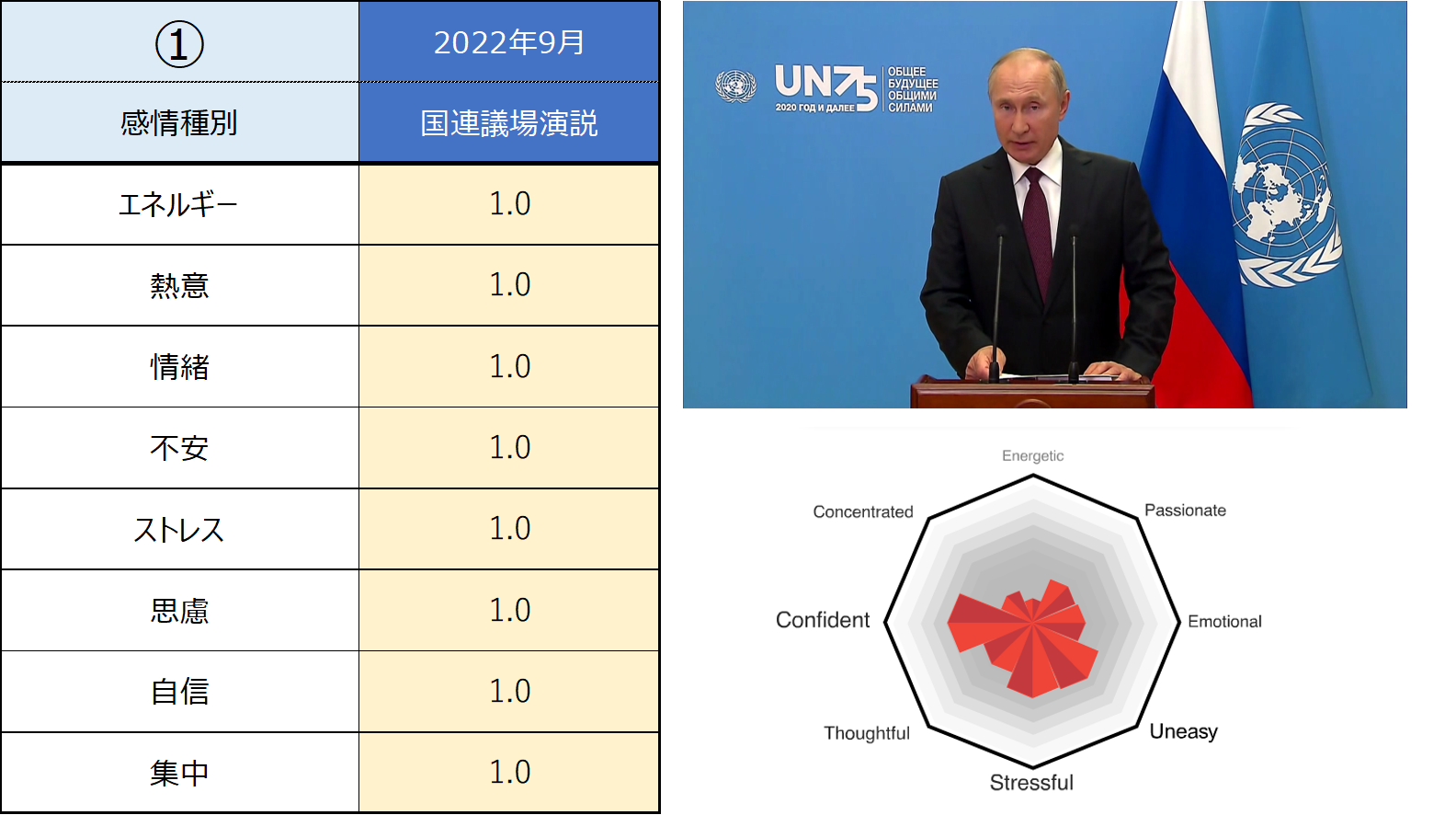 今回はプーチン大統領の次の演説について「エネルギー」「自信」「ストレス」など約20種類の感情についてデータを取得しました。感情は時間的に変化しますので、ESASでは約2秒毎に感情データを取得するので例えば3分の演説では約90個の感情データが出力され、その平均値を計算してその演説の感情値とします。
